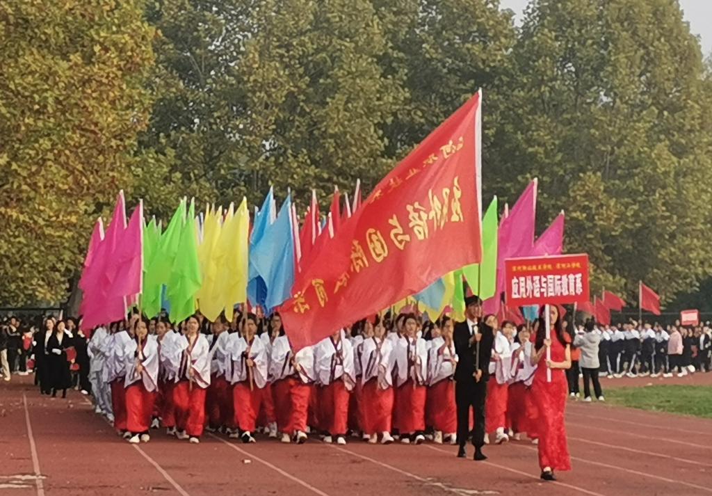 队形变换,依次排开,彩旗飞舞,汇成“文”字。青年学子要传承中华优秀传统文化,坚定走中国文化自信的道路。青年一代,在党的光辉照耀下,积极拼搏,奋勇向前,用青春书写无愧于时代、无愧于历史的华彩篇章!