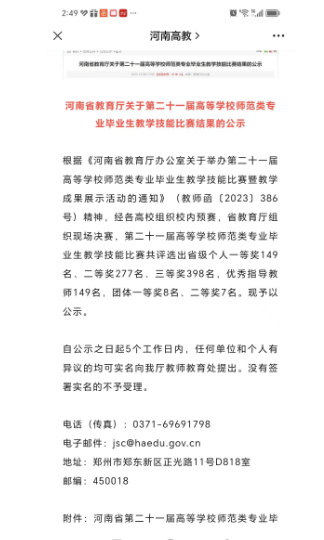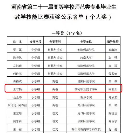 河南省教育厅近日发布《关于第二十一届高等公司师范类专业毕业生教学技能比赛结果的公示》,太阳集团tyc9728(太阳集团tyc9728)英语教育教研室陈利亚老师指导的选手王智楠荣获小学英语学科一等奖,语文教育教研室孙晓芳、赵鑫彦老师指导的选手孟子怡、王诗春分别荣获小学语文学科二等奖和三等奖,小学教育教研室秦敏老师指导的选手王忆文荣获小学数学学科三等奖。